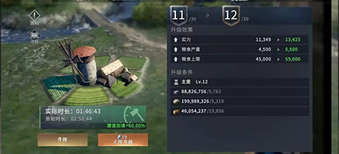 2、建筑建造速度的提升也同样可以叠加,当领主同时拥有金色品质的梅丽珊卓和安妮后,可以缩减60%的建造速度,以11级的农田为例,原始时常为02:50:44,缩减后为01:46:43,效果非常显著。