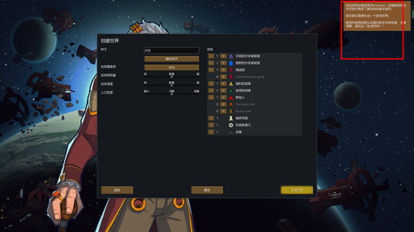 原版游戏中,选择了剧本和叙述者后就可以看到创建世界的相关选项:有地图种子,全球覆盖率,总体降雨量,总体温度和人口密度(新增)的设置。地图种子类似游戏世界的存档,只要输入的种子一致,生成的世界也一致,全球覆盖率指一颗星球上有多少的陆地面积。