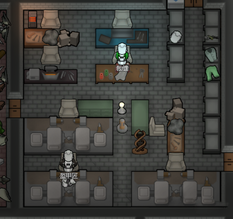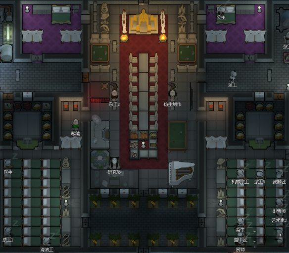 首先介绍一下大厅,同时承担了谒见厅宿舍研究室餐厅娱乐间的作用,所有沙发上面开了天窗,保证户外活动充足,不会得幽居症。14个白银大雕塑把美观度堆到奇迹非凡,房间收益最大化,屏风也用了敲击兽皮,一个屏风有64美观度还算不错了,而且不占用空间值。白银地板增加清洁度和美观,而且属于高级地板,可以在谒见厅使用,多功能大厅的好处是,堆房间的感官收益非常大,小人在这里无论做什么,都会享受房间美观度增加的心情。缺点是,很怕空投破坏房间各种设施影响美观度,所以这里用了屏风隔断,把宿舍分了出去,如果遇到空投,可以卡拐角进行射击。还有就是如果不能及时打扫,灰尘会影响美观度,造成小人心情下降,所以基地里单独设置了个装作息戒律器的小人24小时打扫。望远镜左边的是殖民地管理mod里的,是用来测试或自动化管理基地用的。