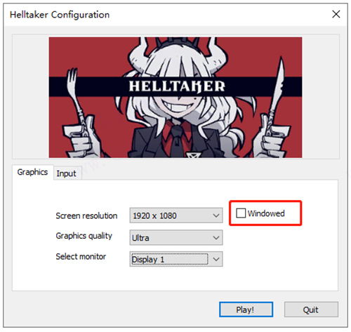 3、如果上一步没有点击是的话打开游戏本体找到“Helltaker.exe”双击也可以打开游戏,这里游戏设置默认即可,小编这里推荐选择窗口模式,如果想要全屏可以不勾选;