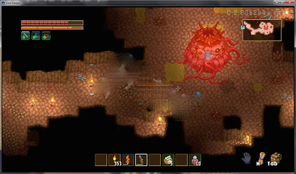 仔细观察地面,有五个会释放小怪的虫洞,拿虫巢墙壁将它围住。虫巢墙壁就在周围,用炸药炸两三次就能破坏。即使用目前最好的铁镐也得挖很久,耗损太大,不推荐。