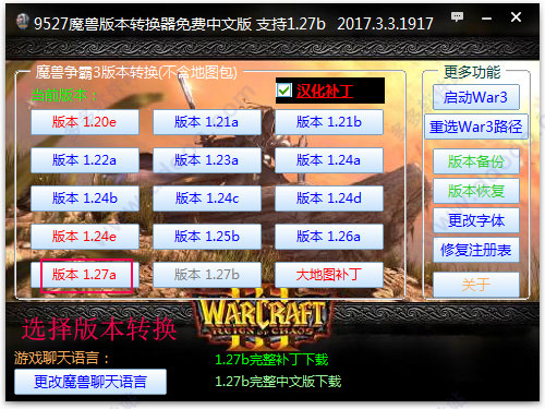 目前支持转换1.07以上的版本,可以转换成1.20e至1.27b之间的任一版本。但建议使用1.20e至1.27b之间的魔兽争霸完整安装包,以确保不会出现问题。