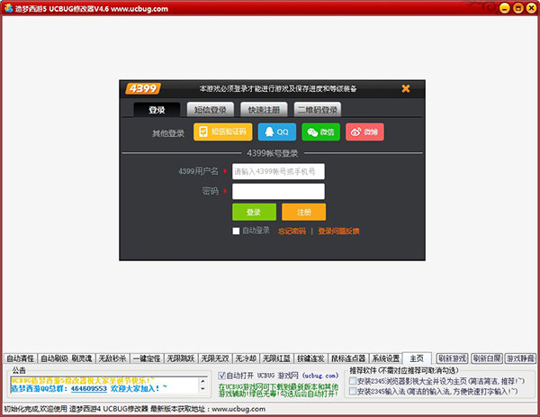 2、双击运行"造梦西游5 UCBUG修改器V6.0.exe"打开,点击开始,输入你的密码和账号;