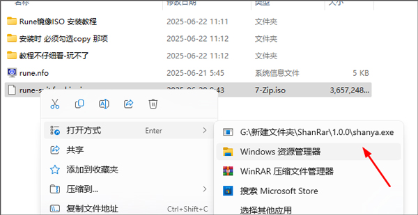 1、在本站下载解压,找到rune-suit.for.hire.iso,鼠标右键点击,选择打开方式为Windows资源管理器;
