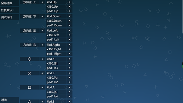 ■-- 左手- 方块键 ▲-- 右手- 三角键 x-- 左脚- 叉键 -- 右脚- 圆圈键 放-- 手指瞬间放开方向健 。