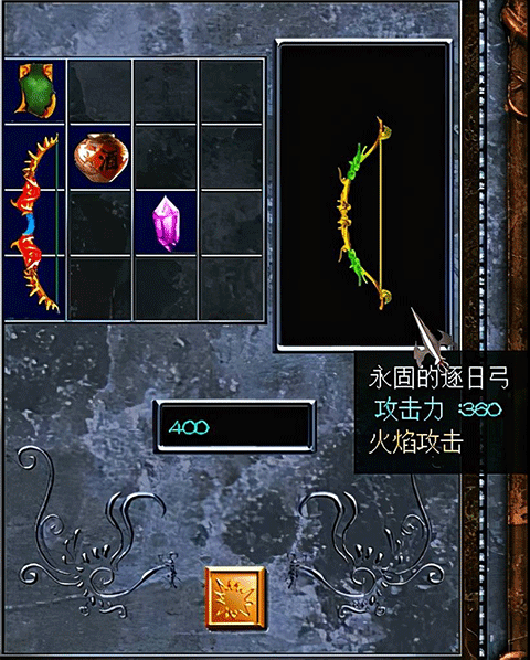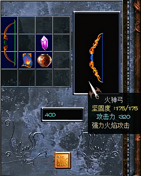 通天弓,紫水晶,力量之酒,毒符咒加起来等于永固的日常弓。带火焰攻击,攻击力虽然比火神弓强一点,但附加属性稍差,有好有坏。