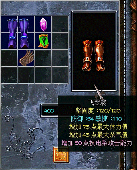 凤头靴,紫水晶,太极符,智慧之水加起来起等于八卦靴。就属性而言,比飞懿好一点。