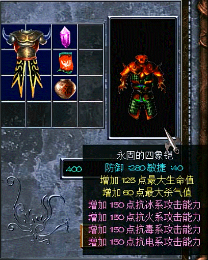 金刚甲,紫水晶,火凤凰书,力量之酒加起来等于永固的四象铠甲,这就是终极铠甲,各方面都超过了龙鳞铠甲和金刚甲。