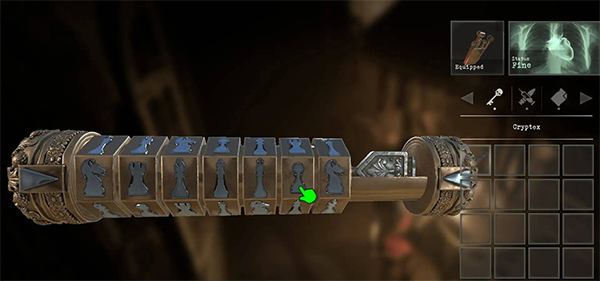 在物品栏中检查密码筒,并按从左到右的顺序排列棋子:骑士-城堡-主教-皇后-国王-士兵-骑士。