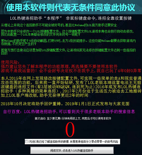 1、下载软件压缩包文件,直接点击“LOL热键连招助手v1.1_se.exe”启动程序即可,首先请仔细阅读软件协议,如下图所示: