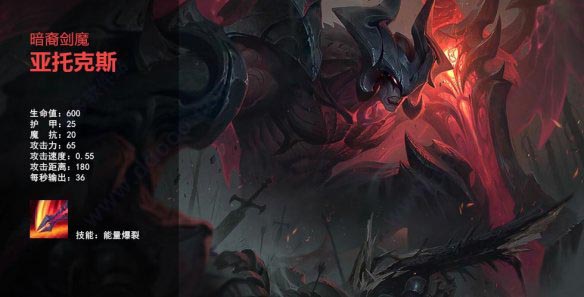 技能介绍:暗裔之刃,亚托克斯顺劈他面前的区域,对区域内的敌人造成伤害。
