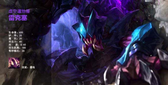 技能介绍:遁地,雷克塞遁入地底一小段时间,来变得无法被选取并治疗自身。当雷克塞破土而出时,她会造成伤害并击飞距离最近的敌人。