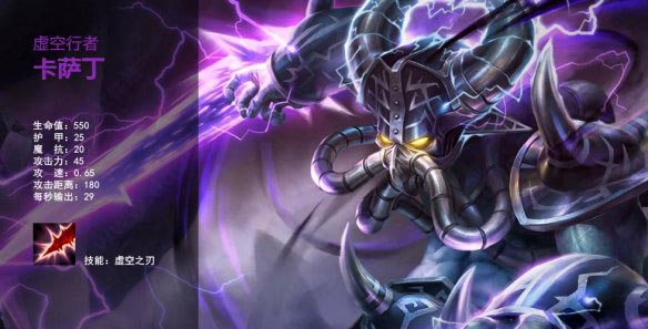 技能介绍:虚空之刃,卡萨丁的攻击可从敌人那里偷取法力值,并将其转化成一层护盾。