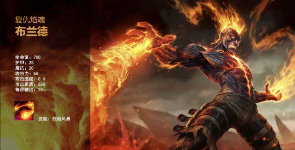 技能介绍:烈焰风暴,布兰德发射一团会弹射的火球,对命中的所有敌人造成伤害。