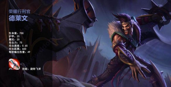 技能介绍:旋转飞斧,德莱文获得额外攻击特效伤害和攻击速度。至多可叠加2次。