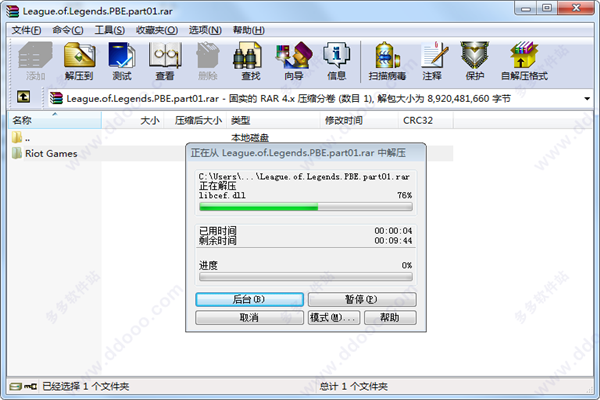 1、通过本站提供的百度网盘链接,下载游戏文件至电脑中,并解压缩League.of.Legends.PBE.part01.rar文件。