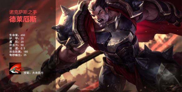 技能介绍:大杀四方,德莱厄斯挥舞他的斧头,对附近的敌人造成伤害并基于他的已损失生命值来治疗自身。
