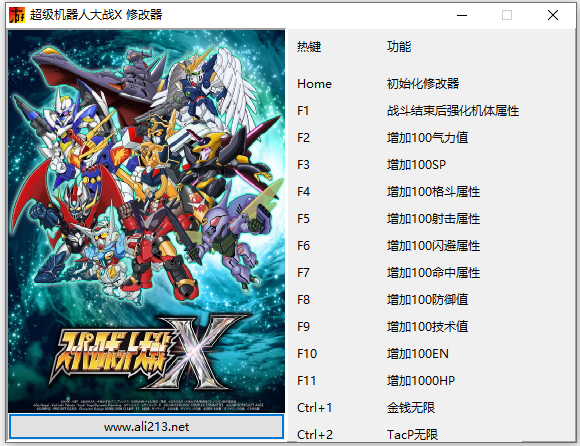 F7 - 增加100命中属性(需要先初始化修改器后,选中一台机体查看能力,再修改,修改的是当前查看的机体)