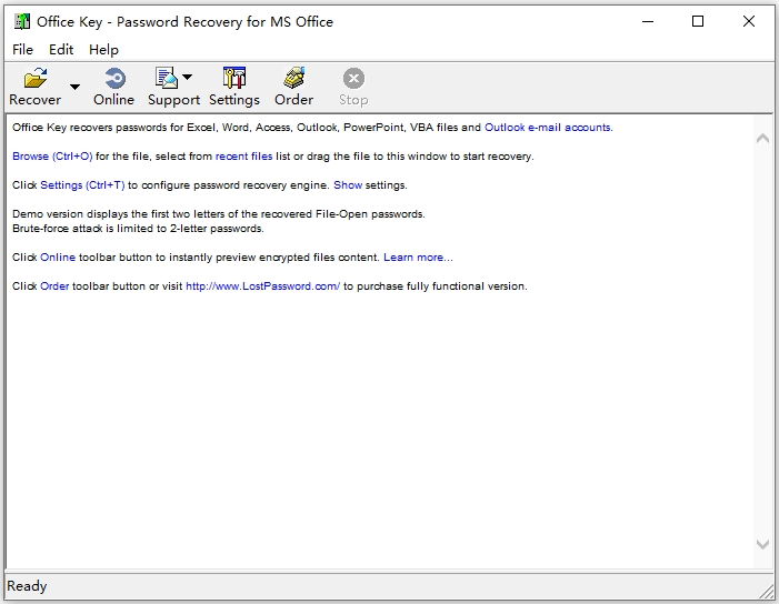 Office key文件密码恢复工具是由Passware软件推出的一款Office密码恢复工具,它可以迅速恢复Office文件(Access、Excel、Outlook、Word、Visual Basic)的密码,同时它还支持多语言密码设定,内有的文件密码回复功能。它能够借助其官方密码破解服务器的解密密钥(因此你的电脑必须能够连接到Internet且不能被防火墙软件拦截),在极短时间内清除Office系列的文档打开密码,非常的强大且实用,有需要的朋友可以来多多软件站下载使用哦~
