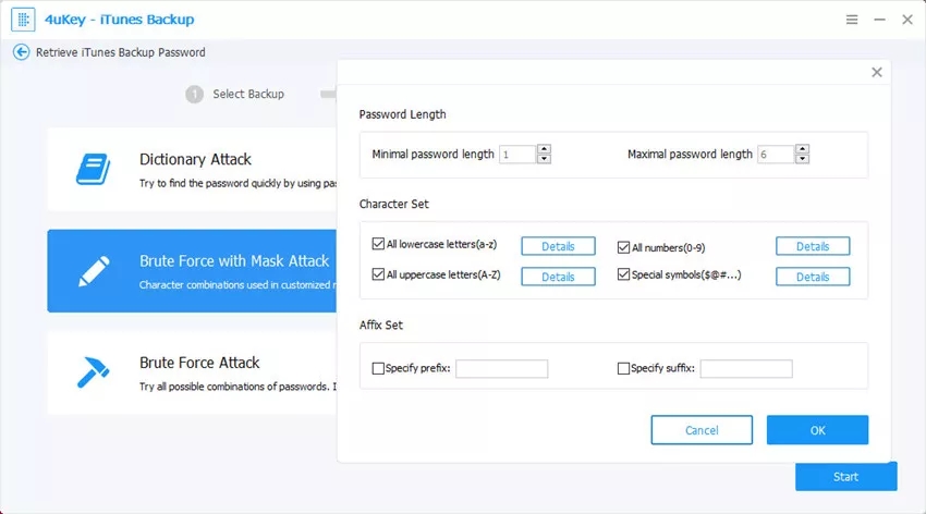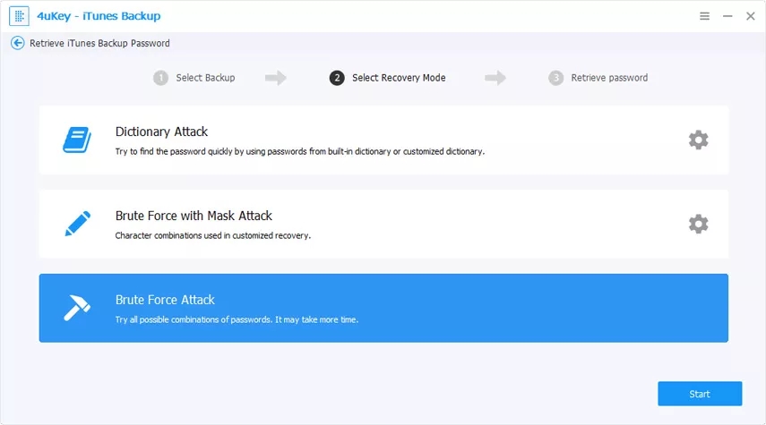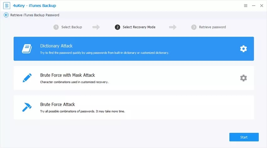 接下来,您将在界面上找到3种类型的攻击,即字典攻击,暴力攻击和暴力攻击。选择最合适的一个有效检索iTunes备份文件密码。