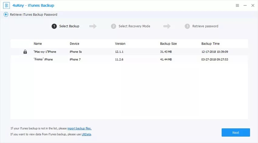 步骤2:然后将列出此计算机上的所有iTunes备份。选择要删除其密码的密码,然后单击“下一步”按钮。