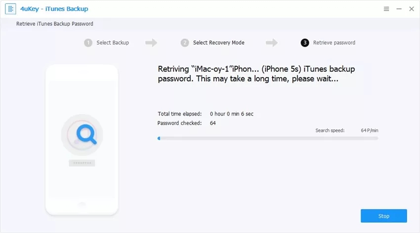 当所有这些都解决后,单击开始按钮,然后4uKey - iTunes备份将开始查找密码。在解密过程中,如果您有紧急情况需要处理,则可以点击“停止”按钮。当你回来时,你可以继续解密。