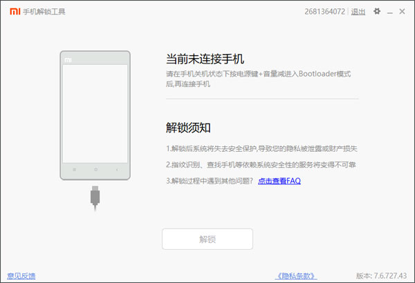 4、在PC端的小米解锁工具书,登录相同的具备解锁权限的小米账号,并通过USB连接手机;