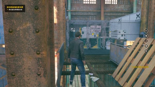1、先打破铁板上方的铁钩,穿过后攀上左边的障碍物来到木箱上方。