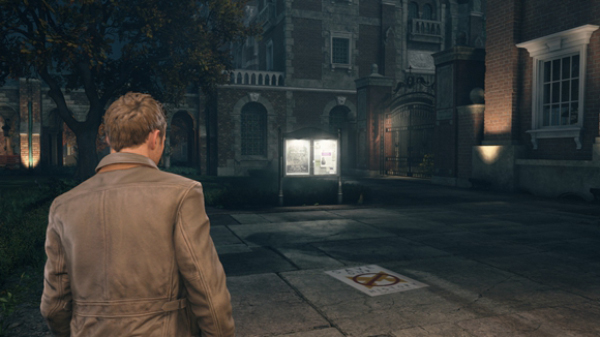 7、继续朝任务目标走(按TAB键显示目标方位),来到设施门前,别着急进门(会无法回头),门左侧两张海报即是第6/10个文件(8/16)和第7/10个文件(9/16)。