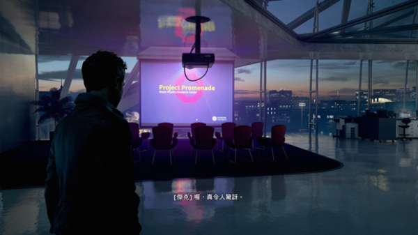 10、上电梯到设施二层,映入眼帘的是发着紫光的大屏幕,坐在最前排中间的座椅上听保罗的简报即可收集到第3/3个媒体(12/16)。