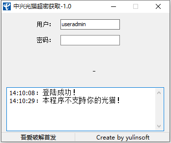 ②打开本工具软件,用户名和密码在光猫后面可以看到。输入用户名和密码,点击登陆获取就可以了。如果下面显示出超密,说明支持你的光猫。