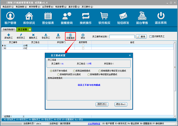 5、可设置商品的提成模式,如销售每一件提成多少元、按商品的销售额提成、按商品的销售利润提成