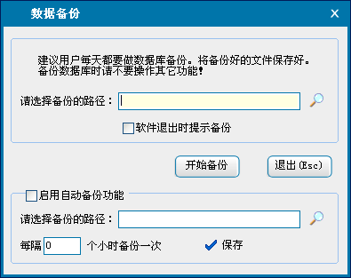 用于对本程序数据库的备份,建议用户养成备份数据库的好习惯,以免种种原因造成数据丢失能够及时找回历史数据,避免造成不必要的损失。建议启用软件自动备份功能,定时对软件数据库自动进行备份。
