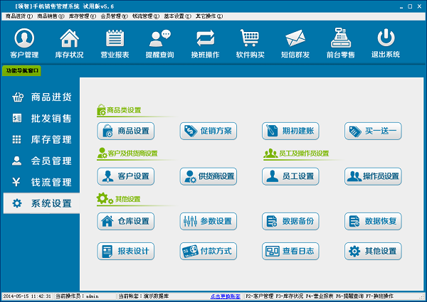 系统设置包含商品设置、客户设置、供货商设置、员工设置、操作员设置、仓库设置、数据库备份、恢复和其它设置等几个部分,用于设置系统的基础数据信息和系统功能相关的参数。