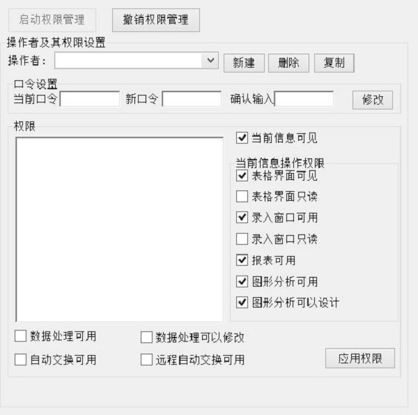 用户可以选择用户权限设置是否启用,如果没有启动权限机制,用户默认以超级用户Admin的身份进入系统。如果启用,用户在登录时就会显示登录窗口,并根据授予的权限确定做相应的操作。只有超级用户才能进行权限设置,可以创建用户和分配权限。也只有超级用户才拥有系统二次开发。