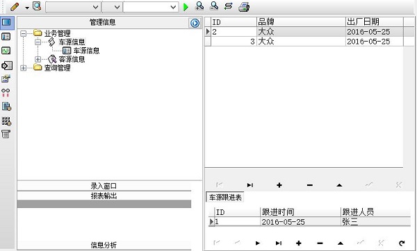 表格界面表格界面以表格的形式显示信息内容。 表格界面在“信息操作”区中,用表格的方式显示和操作信息。 表格界面的有上方工具栏(表格信息操作工具栏)和左侧工具栏,用来实现信息操作,中间大部分空间均为表格方式显示的信息。