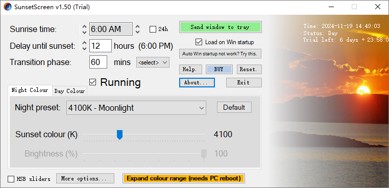 在Win启动时加载:选择此选项可在每次Windows启动时加载SunsetScreen。