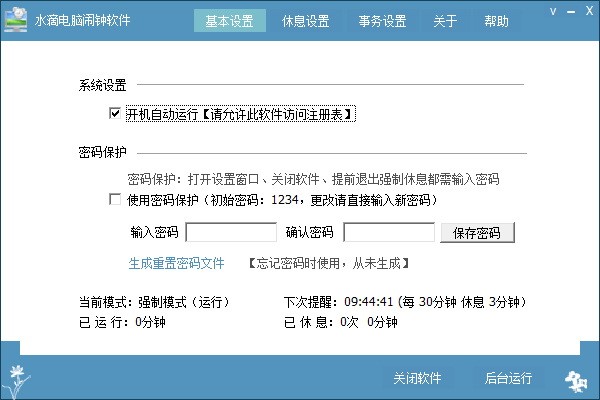 可以提前退出强制休息、打开设置界面、关闭软件操作需输入密码。建议在孩子使用时选中此项。密码可直接修改,忘记时可删除软件后重新安装。选中‘强制模式’+ 基本设置的‘密码保护’后,可控制孩子长时间使用电脑不休息的情况,保护健康和视力。
