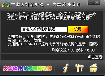 大拿万能老板键主要提供根据标题关联窗口、自动控制当前最顶层的窗口、控制指定程序的窗口及白名单等功能模块,能够实现对绝大多数程序添加老板键的完善流程控制,节省费用和时间,提高客户满意度,有需求的朋友请下载体验。