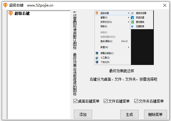 4、容许客户将不同种类的应用程序都加入到鼠标右键上。
