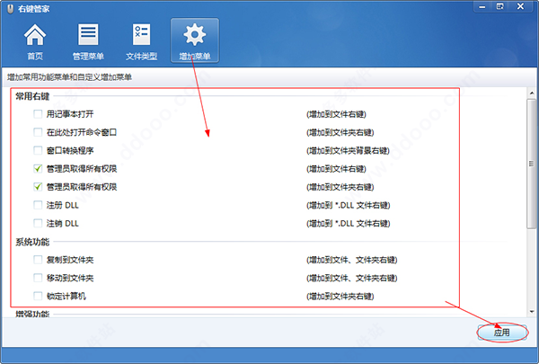 9、右键管家还提供了对右键菜单的添加功能,您可以通过选择并勾选相应的项来实现您对右键功能要求的添加,从而将自己常用的选项添加到右键菜单中