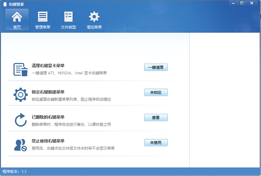 3、右键管家有四项大功能,比如首页、管理菜单、文件类型和增加菜单