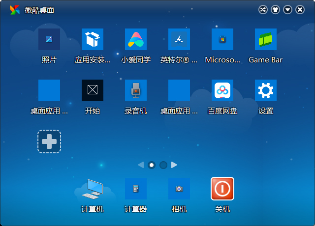 微酷桌面是一款十分的小巧的桌面工具。它能将桌面的程序的快捷方式像手机一样整齐罗列出来,用户只需要用鼠标点击就可以打开程序,非常方便,它里面内置的功能都会通过大字体、大图标显示,让你更快找到自己需要的软件,轻松解决win桌面软件太多,不容易找到软件等问题,同时也提供一个热键启动和关闭微酷桌面,非常的便捷,如果你用过小Q书桌的话,会发现2者非常像,他们都使用了和iphone一样的图标管理方式,十分适合用来管理windows中的绿色软件,需要的朋友欢迎前来下载体验!