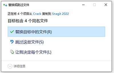 6、打开软件安装路径,把crack文件里的破解补丁复制到C:\Program Files\TechSmith\Snagit 2022安装路径下进行替换即可,软件就成功破解了。