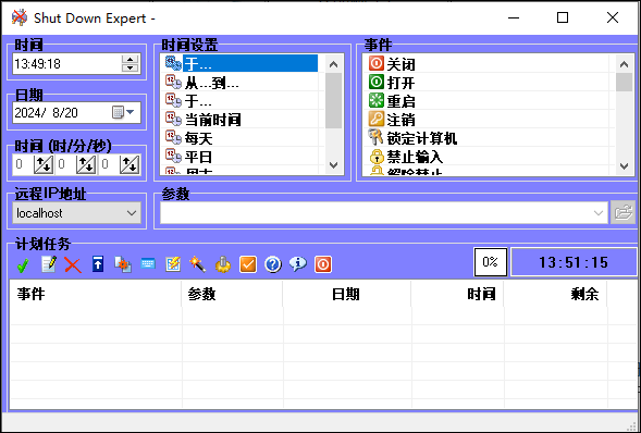 ShutDown Expert是来自国外的一款功能丰富,方便实用的多功能开关机管理程序。该软件集时间管理、时间笔记、远程IP等功能为一体,除了可以定时关机、重启电脑,即使离开电脑也可以让它自动关机。
