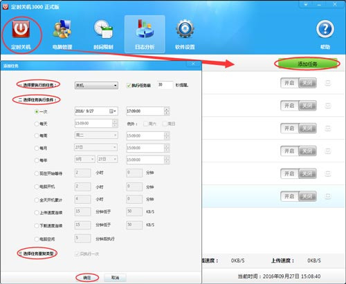 打开定时关机3000,点击软件窗口上方的“定时关机”,然后点击“添加任务”。在弹出的“添加任务”窗口中,在“选择要执行的任务”后面的下拉菜单中,选择需要执行的任务。然后在“选择任务执行条件”中,有11种不同的执行条件,可以根据自己的需要进行设置。如果勾选“只执行一次”,设置的任务执行一次后就关闭,不再执行。设置完成后,点击“确定”。然后在弹出的对话框中点击“是”,启动设置的任务。设置成功的任务会显示在定时关机任务列表中。