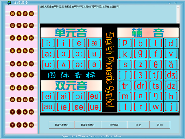 英语音标殿堂(phoneticshome)是一款简单的学习英语音标的软件,这款软件采用电脑辅助教学来提高学习效率,由浅入深、由易到难,循序渐进的学习,图文并茂,还有各种精彩的Flash动画,运用大量生动有趣的动画和目前国际最先进的英文语音朗读技术,带你进入一个全新的英语环境。由于目前社会环境的日益国际化,对外语能力的需求使得掌握一门外语,特别是英语越来越受到大家的重视,如果你现在在学习英语,你不妨试试这款英语音标殿堂phoneticshome ,它是目前学习英语音标和基础英语功能最全面的一款软件,相信一定不会让你失望的!
