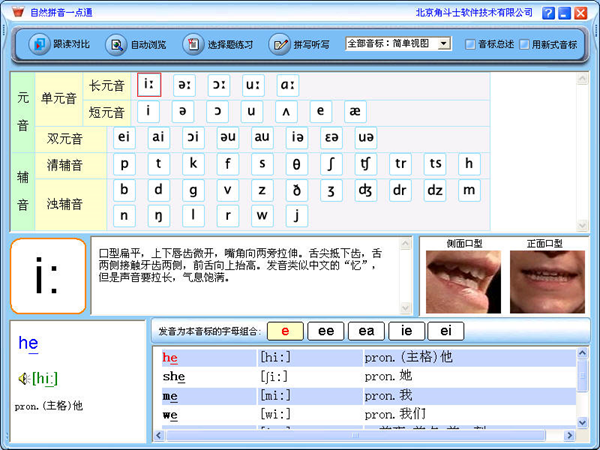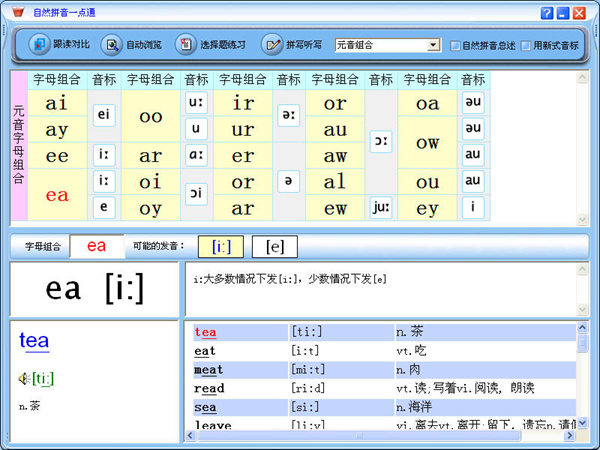 3、在“音标学习”和“自然拼音”界面中,都可以进行“自动浏览”。软件自动读出一个个音标及其对于的字母组合,以及该字母组合在单词中的例子。
