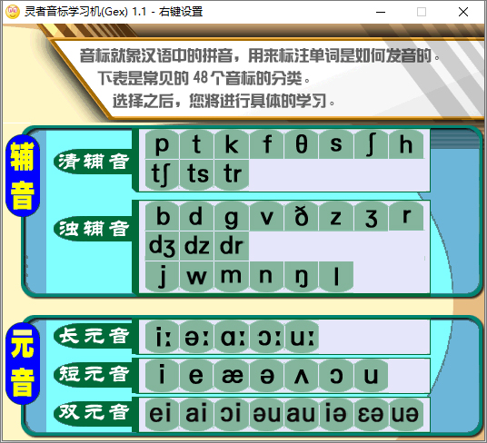 滑过或点击音标可以发出其读音或弹出音标信息(右键可设置)点击左边的“清辅音”,则连续 朗读所有清辅音,点击“浊辅音”,连续朗读所有浊辅音,点击“辅音”,连续朗读所有的清辅音和浊辅音,点击“元音”(长元音、短元音和双元音)雷同