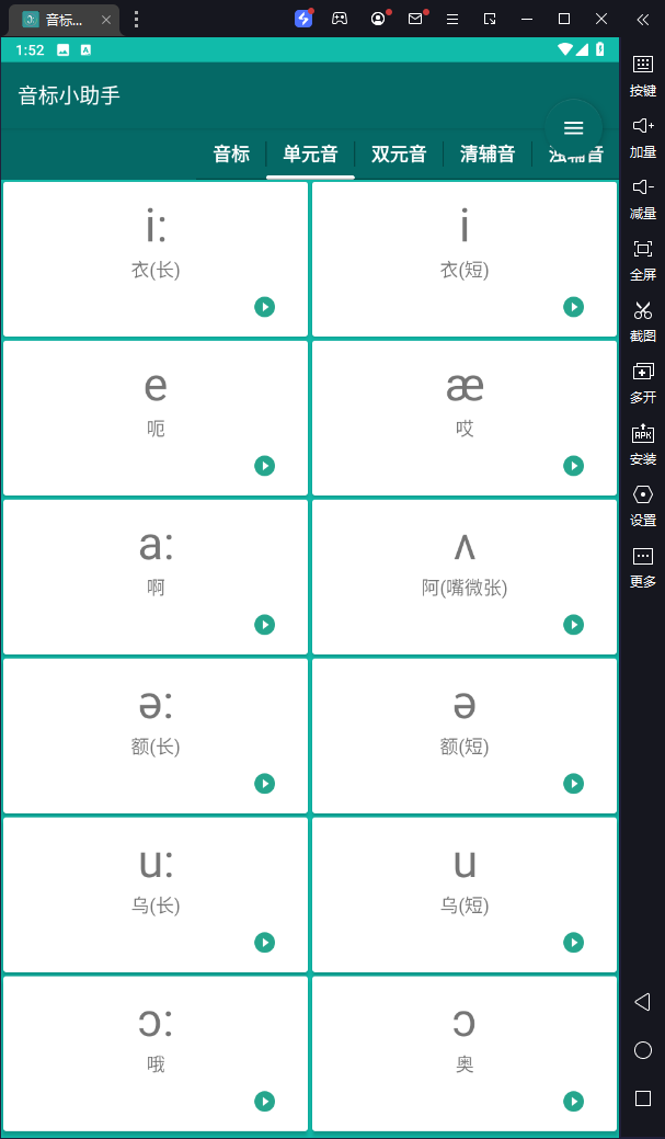 想要学好英语那就得先将英语的音标给学习好,而说起学习音标小编就不得不提音标小助手电脑版啦,它是基于安卓模拟器上运行的英语音标教学软件,可以帮助用户更好的学习英语音标,提供了分组对比学习,元音学习和辅音学习,音标辨析测试学习,视频学习,听词辨音等单元,点击相应音标进行发音学习,听词辨音单元更是耐玩的游戏单元,增加学习乐趣。而且还采用真人发音技术,在线教您学习英语音标,不管是幼儿学生、中学生、高中生或者是大学生等都可以使用本软件,是您学习英语音标的好帮手,现在就下载学习吧!